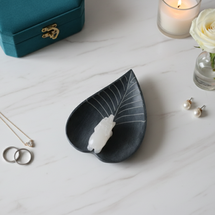 Design: The deep Palewa stone forms a smooth, leaf-shaped tray for rings and necklaces. The meticulously carved Alabaster elephant rests upon it, acting as a charming focal point and adding a touch of symbolic protection and grace.