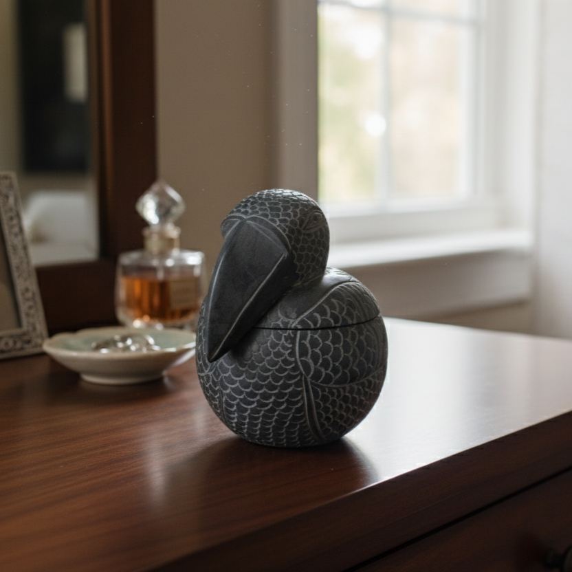 This functional sculpture is meticulously carved from dark Palewa stone, transforming a simple storage box into an arresting work of art. The piece captures the unique form of a resting toucan, with its weighty presence offering both secure storage and a bold, sophisticated accent for your dressing area.